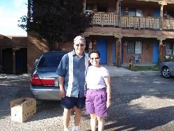 Joe and Doris Guajardo posing outside of their room at the Sun God Lodge in Taos. Doris and Joe are now "empty nesters" with their kids all grown up with children of their own.
