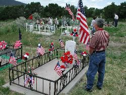 The family of our father - Fidel Montoya, Sr. were able to gather around his final resting place in Questa. This was one of his final requests, that he be buried in the Pueblito Cemetery. Dad died on January 25, 1984. Every year for Memorial Day we come to pay our respects to Dad and place new flowers, a new American flag, and cut away the weeds from around his grave. Andres, unfortunately is hidden behind the American flag.